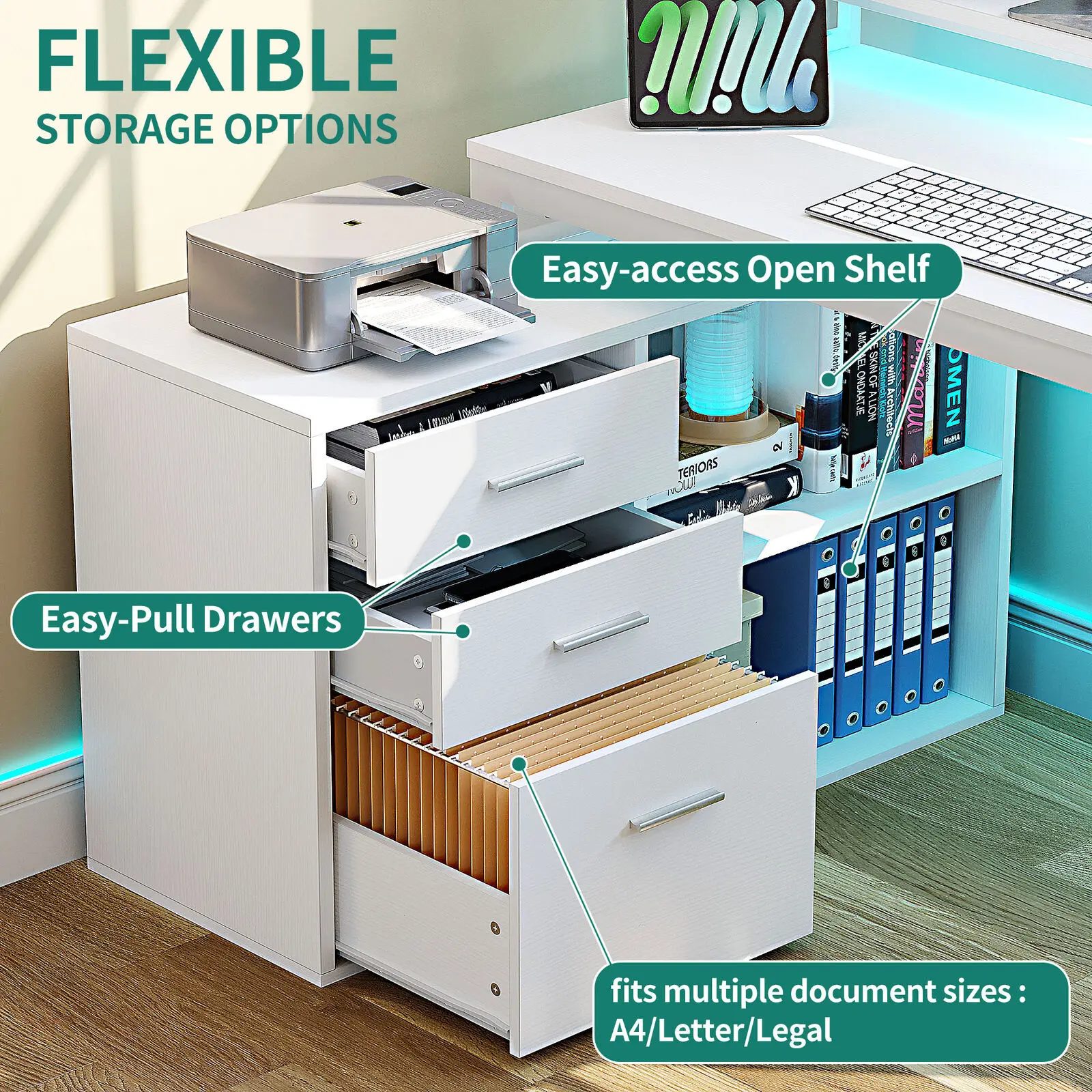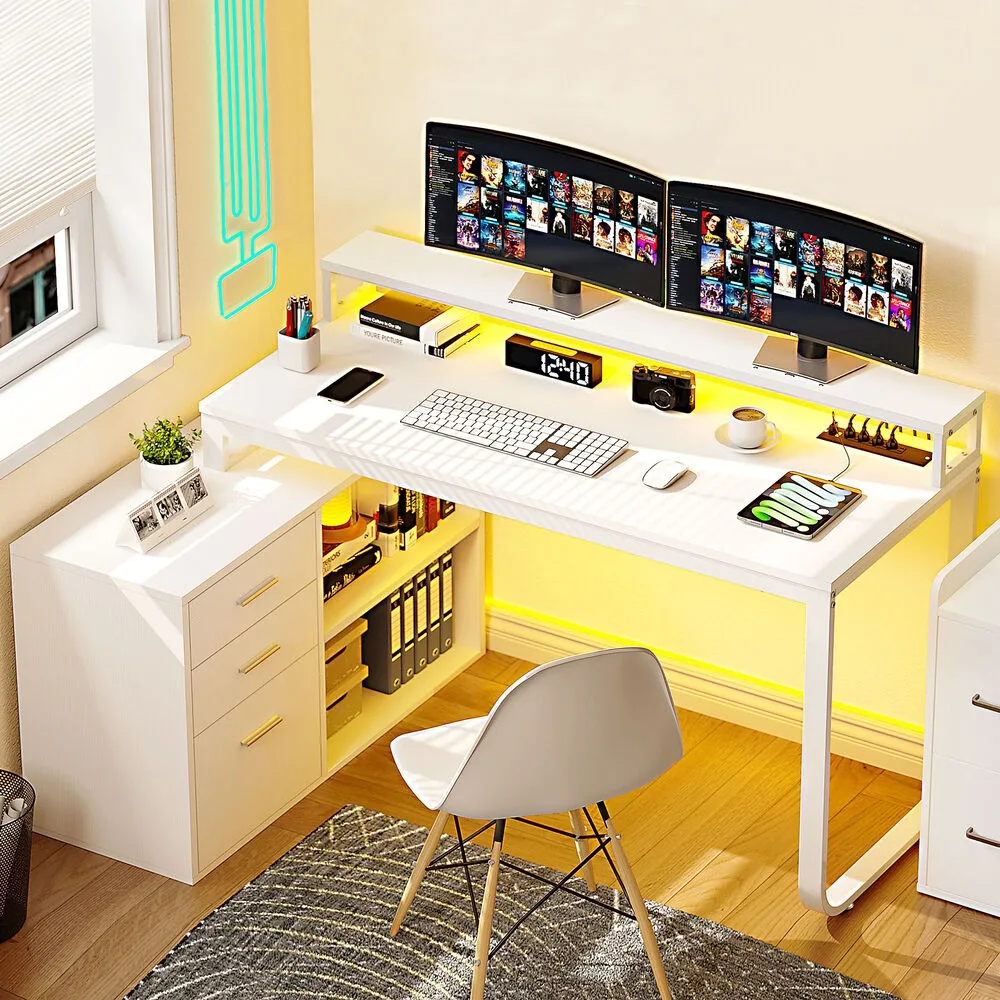 Upgrade your home office, study space, or gaming setup with this versatile L-shaped computer desk. Designed to maximize productivity, it features a wide 55.1” L x 19.68” W desktop with an elevated monitor stand, promoting ergonomic posture and reducing neck and back strain. The desk includes two file cabinets with adjustable hanging bars for letter, A4, and legal-size files, two additional drawers for office supplies, and four open shelves for quick-access storage. A dedicated printer stand keeps printers or scanners within reach, improving workflow efficiency.