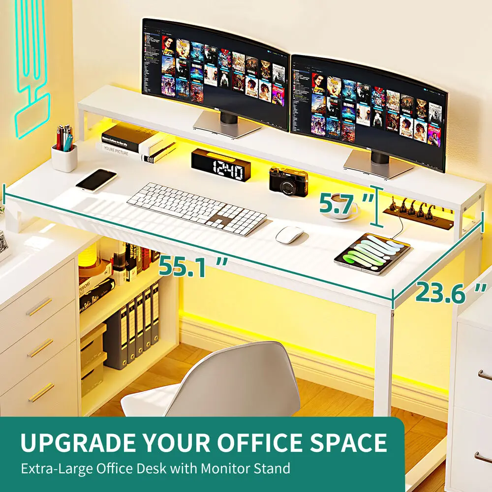 - Wide 55.1” L x 19.68” W desktop with monitor stand for ergonomic posture.